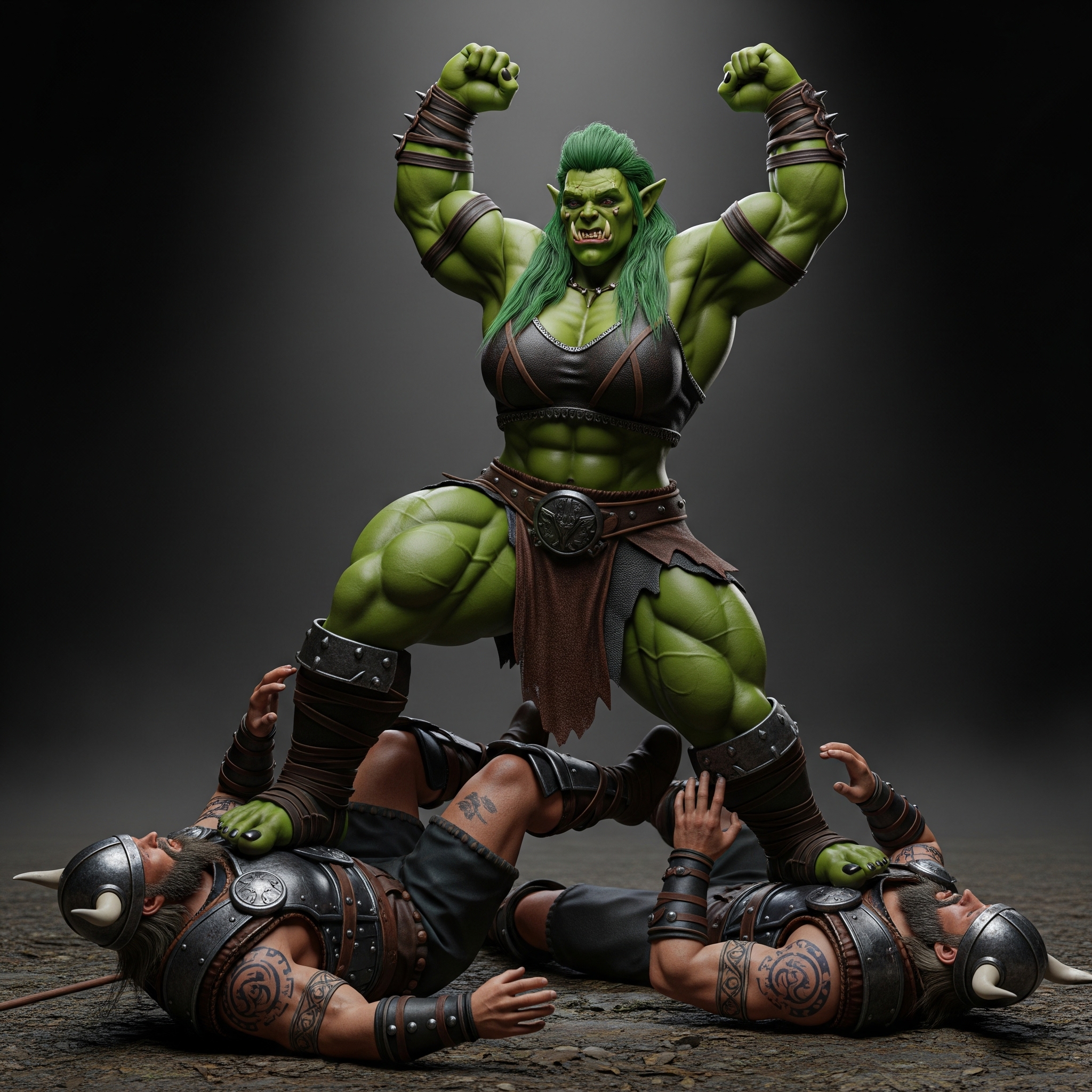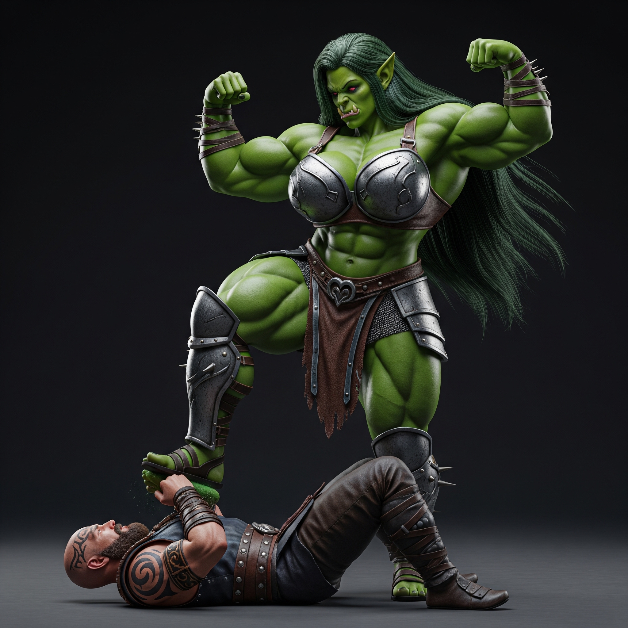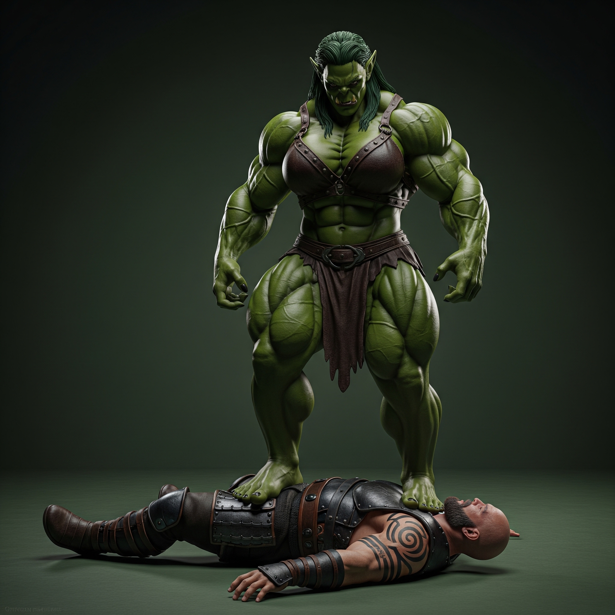 The earth itself trembles beneath the weight of the mighty Orc Warrior Gruda: The Trampler. At over 900lb of solid muscle she will squash you flat and you'll love it...