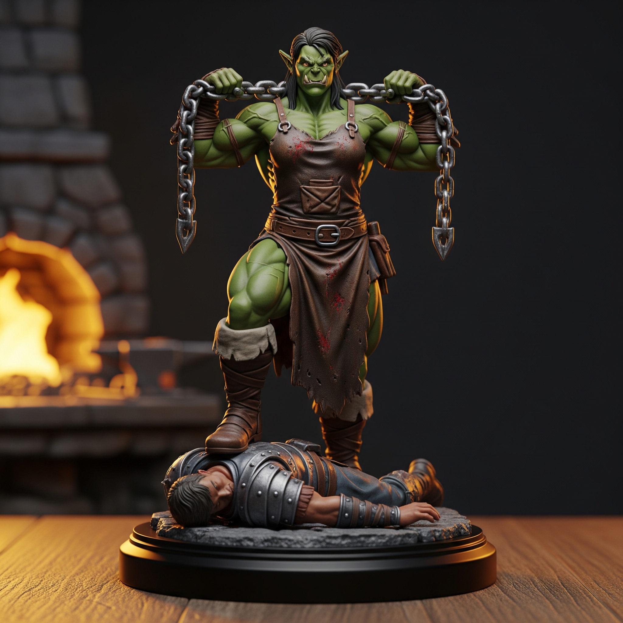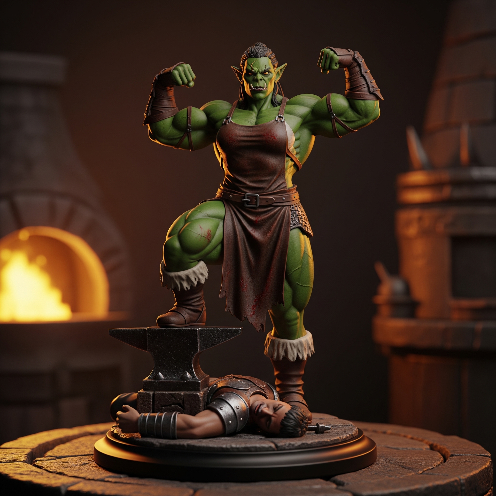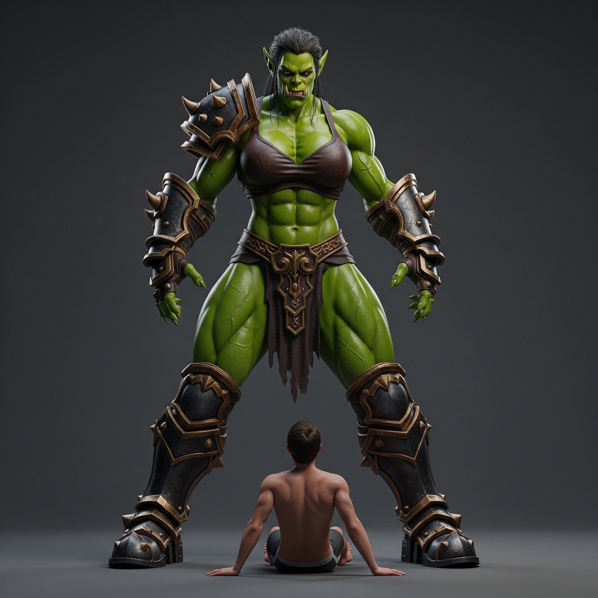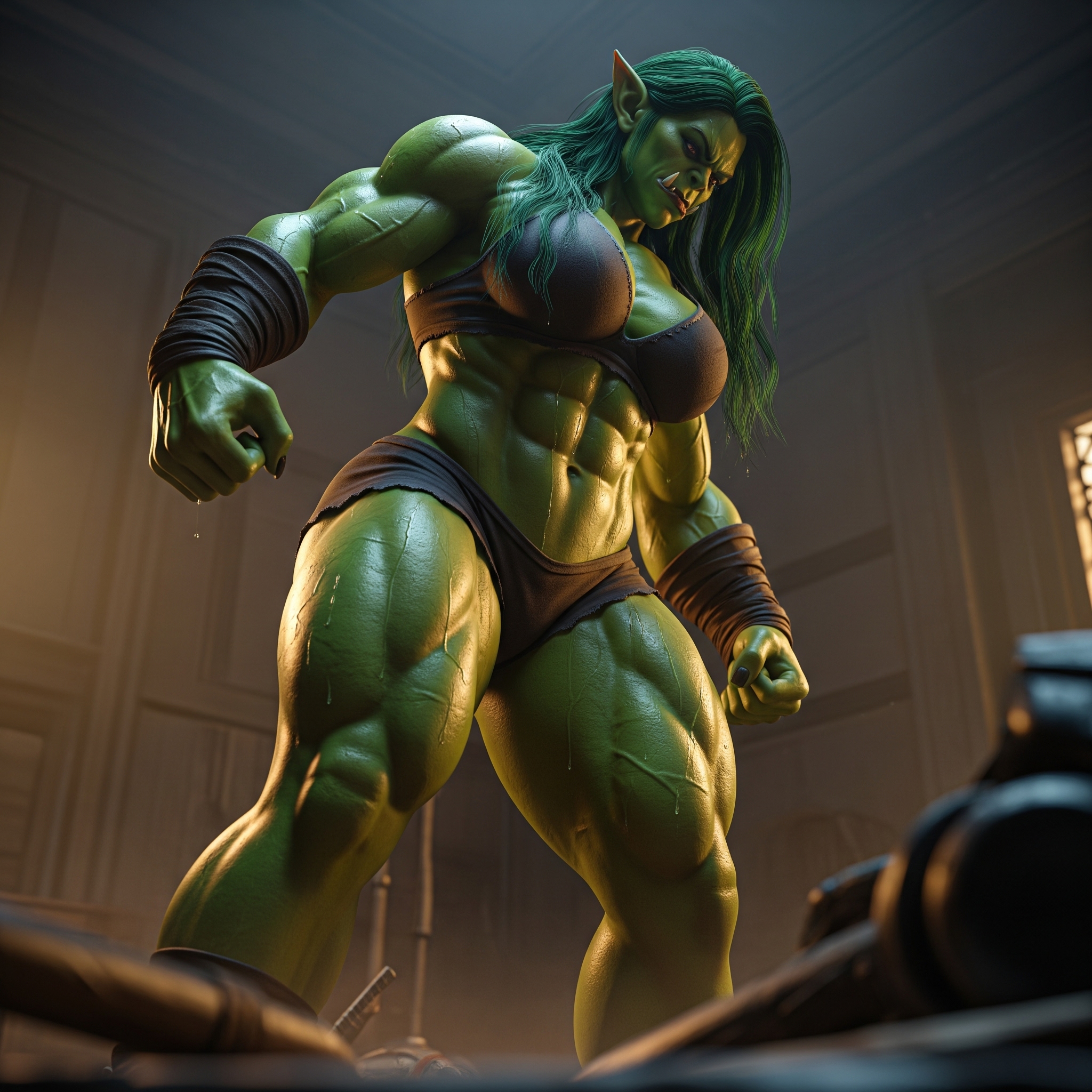 The earth itself trembles beneath the weight of the mighty Orc Warrior Gruda: The Trampler. At over 900lb of solid muscle she will squash you flat and you'll love it...